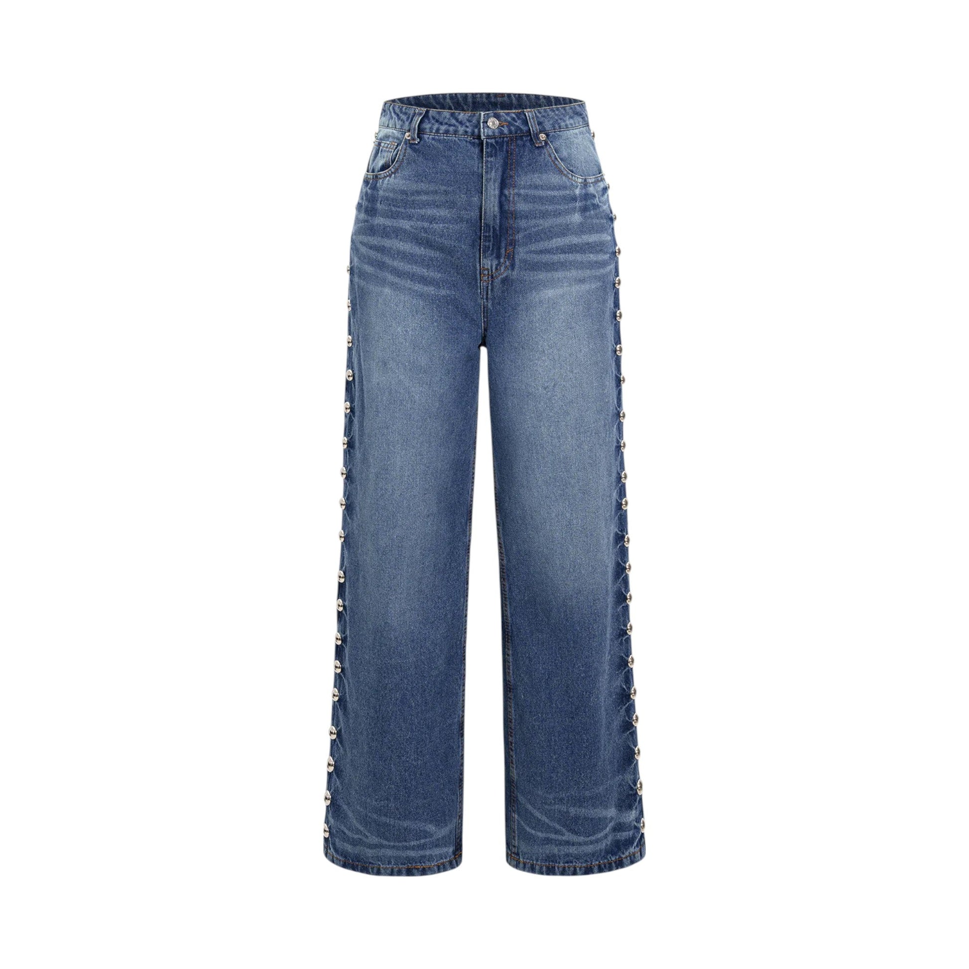 These women’s loose-fit jeans feature decorative rivet accents for a bold, modern take on classic denim. Designed for casual wear, the full-length silhouette offers a relaxed fit through the hips and legs, making them comfortable for all-day styling.